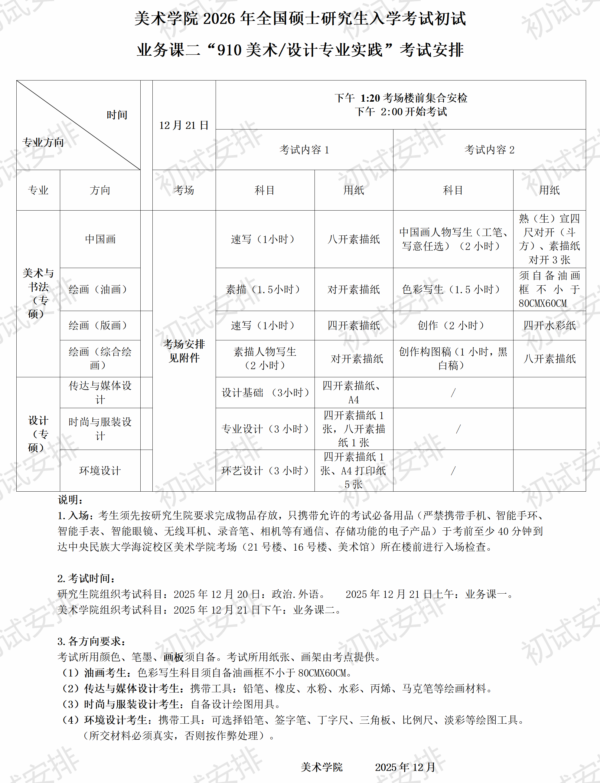 【硕士招生】2026年硕士招生初试“910美术/设计专业实践”考试安排